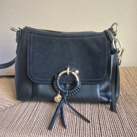 Elegant See by Chloé taske. Sort læder, ikonisk guldring og flettet detalje foran. Brugt begrænset, få brugsspor. (Se billede af bund på taske) Justerbar skulder/crossbody rem.
