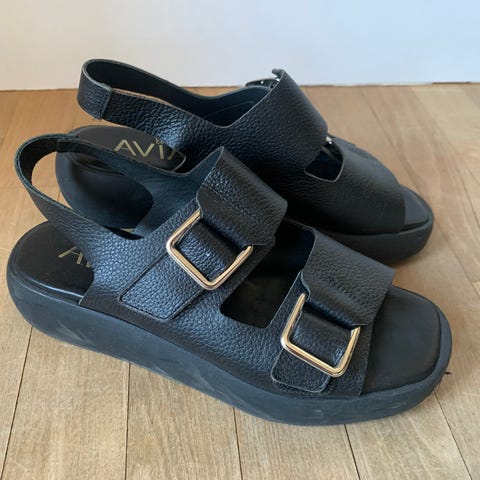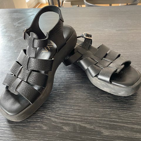 Sandaler med plateausål fra Nordic Shoe People, model Aviaya. Gule remme. Sort sål. Str 38.