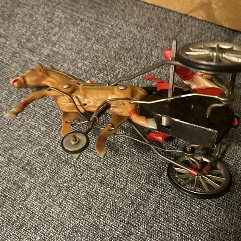 Sjov og kuriøs original pedal sulky med hest, i rigtig god stand og virker og kører godt og når pedalerne trædes så bevæger hestens ben og løber i trav, trehjulet og man styrer med tøjlerne når man kører den, det er et sjældent fund og kan bruges til børn eller på display i en samling da det er et eftertragtet samlerobjekt