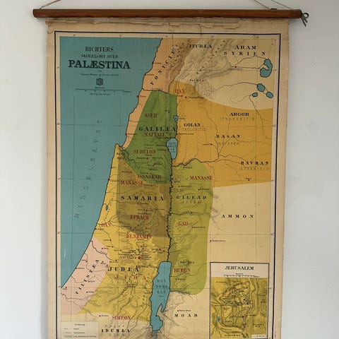 Gunnar Brems og Svend Nørrild kort over Palæstina. Dette kort viser detaljerede geografiske områder, herunder Det Døde Hav og Genesaret Sø. Kortet er trykt af F. L. Pedersen og indeholder en skala for præcis afstandsmåling. Velegnet til historiske studier og geografisk reference.