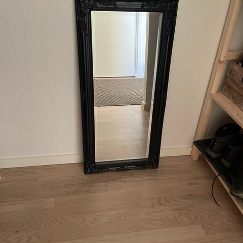 Spejl med sort ramme i fuld længde. Velegnet til vægmontering i bolig eller andre rum.