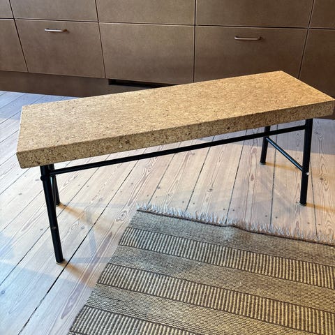 Bænk i sortmalet stel og kork topplade. Fremstår i pæn stand med brugsspor.