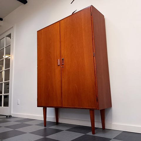 Mange hylder og skuffer i. Fra begyndelsen af 1970'erne. Købt i Hillerød. Dansk.