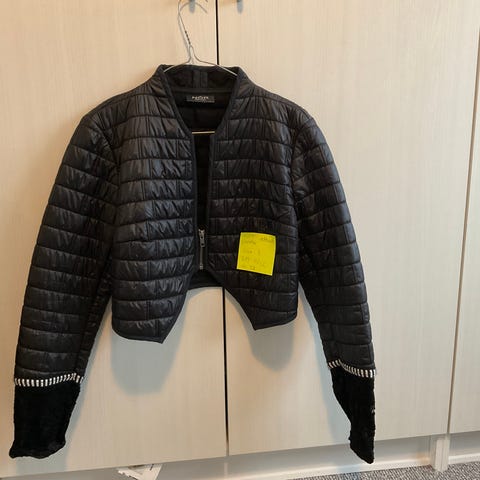 Anden Jakke i sort med guldmønster. Størrelse 44. Uden for. Acelate 63%, Nylon 31%, Polyester 65%. Ideel til kvinder, der søger en unik jakke til forskellige lejligheder.