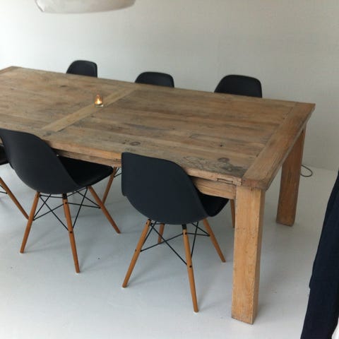 Bordpladen er udført i massiv eg og har med års nænsom pleje udviklet en smuk, sølvgrå overflade med blød patina. Overfladen er behandlet med sæbespåner og fremstår i dag endnu flottere end ved køb. Ønskes en varm tone, kan bordet olieres - det vil i stedet give en smuk gyldenbrun glød, som allerede ses, når bordet er vådt under rengøring. Skriv gerne for testfoto.