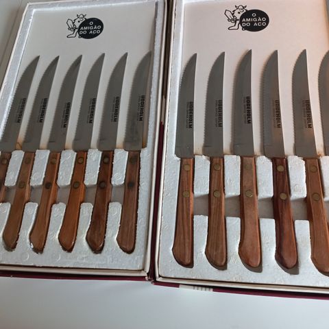 Har disse fine Stainless bestik med træ håndtag har 6 gafler og 6 knive i fin stand.