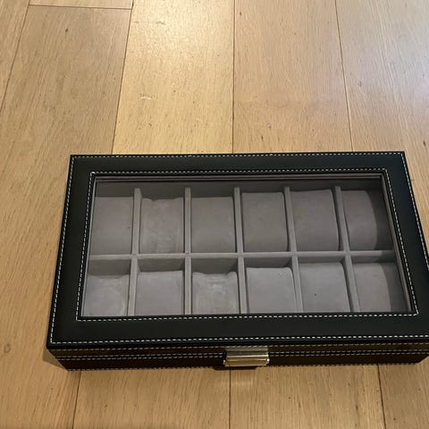 Flot urboks til 18 ure i mahogni lignende træ. Måler 43x30x9 cm. Lås og nøgle. Afhentning. Sendes ikke.