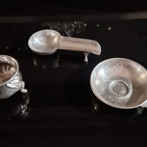 Dansk arbejde. Sølv (830). 2 saltkar med skeer, peberbøsse,