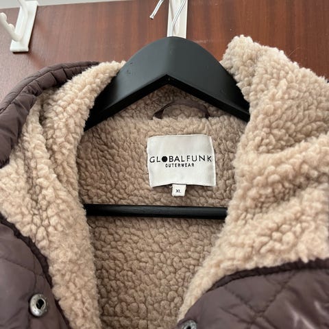 Stoffet er lidt slidt enkelte steder. Misfarvning nederst på foret indeni.