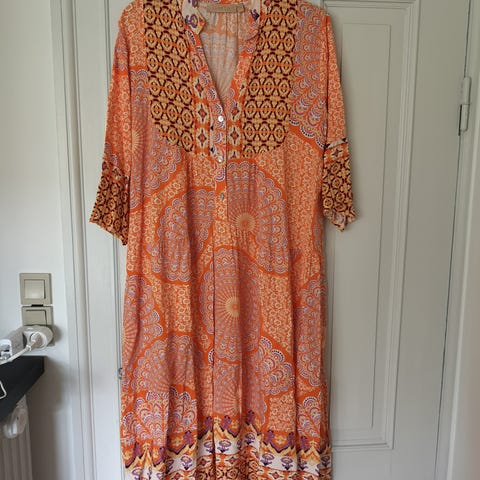 Kjolen har bælte samt regulerbare skulderstropper og flæsekant.