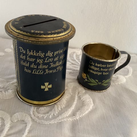 ÆLDRE IRMA TING, Original sparegris MED mønt slisk i blåt glas 400,-