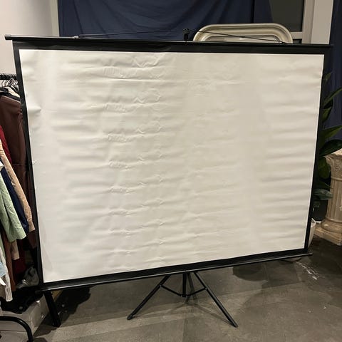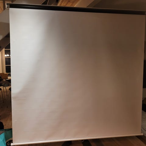 Dette lærred er ideelt til præsentationer og hjemmebiografbrug og måler 160 x 160 cm. Det er let at opstille og transportere, hvilket gør det praktisk til både hjemme- og kontorbrug. Lærredet er monteret på et stabilt stativ, der sikrer en jævn og klar visning.