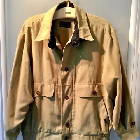 Lys brun ruskindsagtig jakke med 2 skrålommer, 2 indvendige lommer med lynlås og en lomme til mobilen.