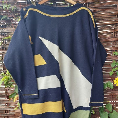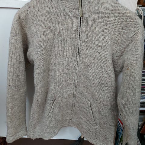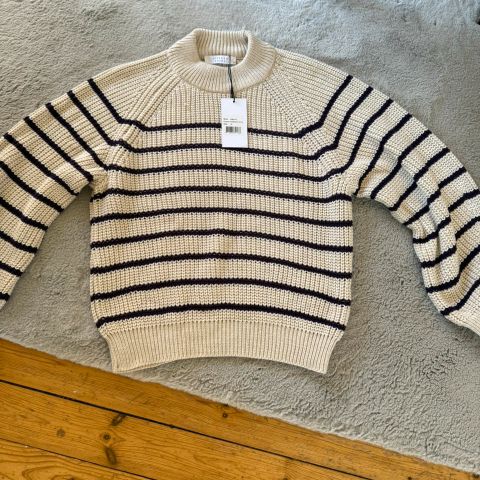 Let vævet sweater i mørk blå, lys blå, hvid og brune striber. 100 % bomuld.