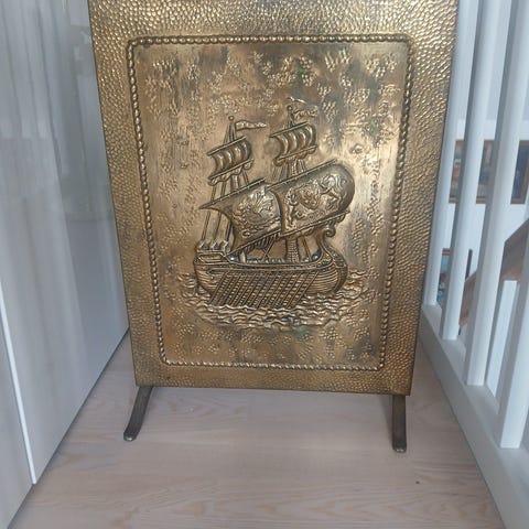 Smuk antik pejseskærm med broderet motiv af to legende børn i et idyllisk landskab. Indrammet i mørkpoleret træ med klassiske ben og fine detaljer. En sjælden og dekorativ genstand – perfekt til den stilbevidste boligindretning.