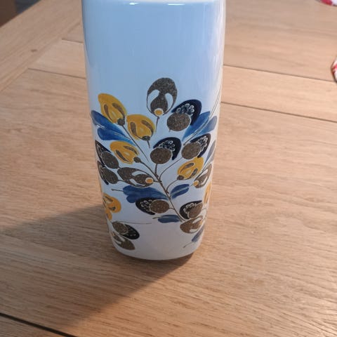 Vasen er 23cm. høj og 13,5cm. bred på det bredeste sted i toppen. Smalleste sted i toppen er 10cm.