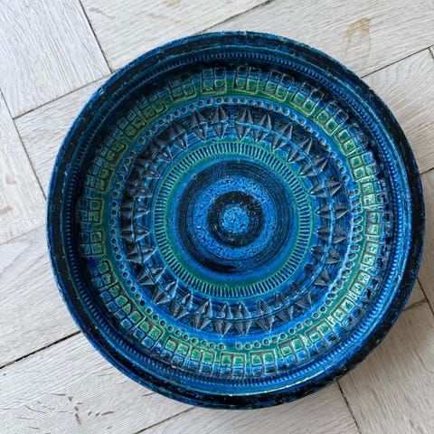 ldo Londi for Bitossi. Askebægre i Rimini-blå glaseret keramik med geometriske mønstre. 1960'erne.