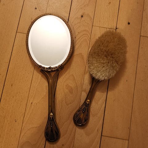 Børste hårene er påsat en træplade som er indfattet i bronce.