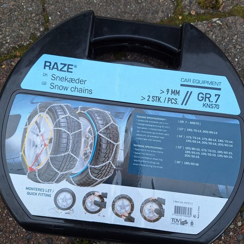 Aldrig brugt. Hurtig montering uden at flytte bilen. Passer til mange dækstørrelser (se foto)