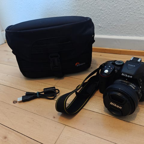 Nikon D5200 (24 MP) med 18-55mm og 55-300mm VR objektiver, 2 batterier, oplader (udlandsstik), kamerataske og søgergummi. Ingen SD-kort. Ny pris ca. 6000 kr