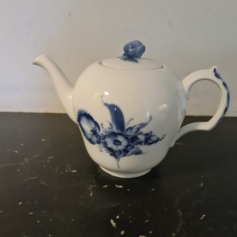 Blå Blomst, flettet, Tekande nr. 10/8122, lille, Royal Copenhagen. Super charmerende og god stand, selvom den er repareret. Reparation er udført professionelt. den er ellers uden skår og låget er helt. Den er fra 1889-1922.