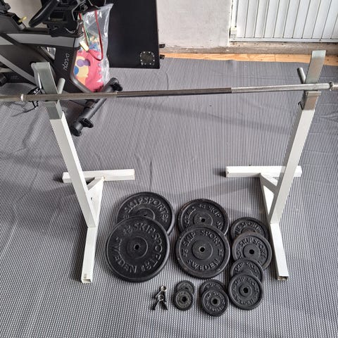 lille diameter vægtstang 8kg ca. 175 cm lang 4 skiver hver af 10kg. Har været i garage så er blevet shinet op med en spray dåse bare til info :) vejer dog stadig det samme ;)