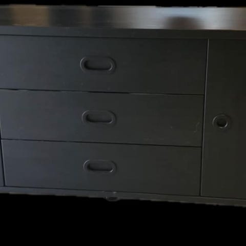 Har tre skuffer samt to låger med i alt fire hylder.