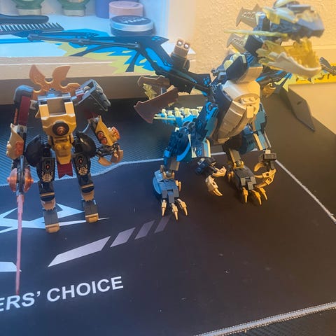 Saettet er komplet paa naer to dele, en klo til Mech’en (derskal vaere fire men vi kan kun finde tre)og en lille blaa klods der skal sidde paa ryggen af dragen. Samlevejledning og original pakke medfoelger. Billigste ny pris 810 kr pluse forsendelse. Vi har sat det ned til 400.