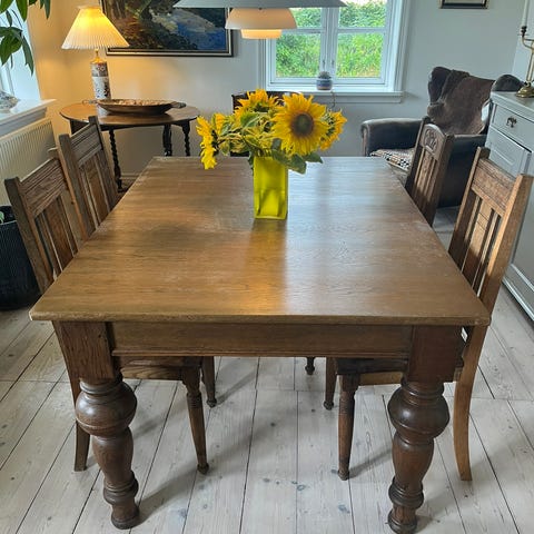 Godt 100 år Gammelt tungt, sjældent egetræsspisebord med 4 egetræsspisestole.