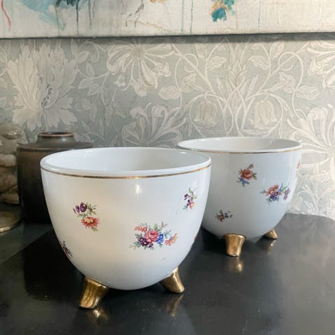 Smukke håndmalede gl potteskjulere med hulkant, begge flot stand - begge 175 kr