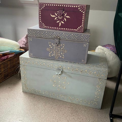Jeg har to store kister som er med fladt låg og på hjul. Du kan sidde på dem eller stille ting på dem.