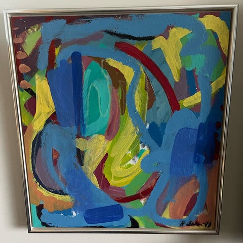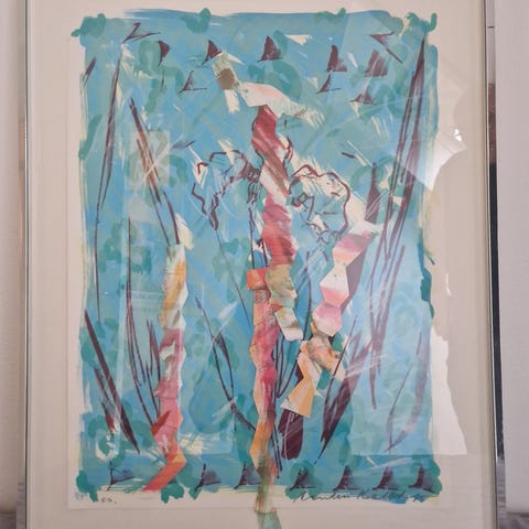 Collage, Inger Hanmann, motiv: abstrakt, b: 90 h: 70, Collage i glas/guldramme, signeret i billedets højre side.