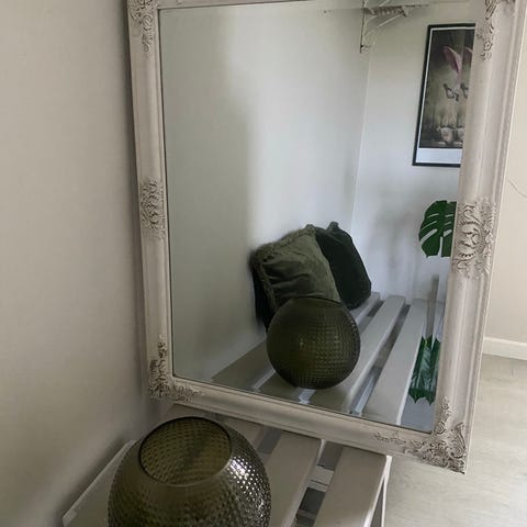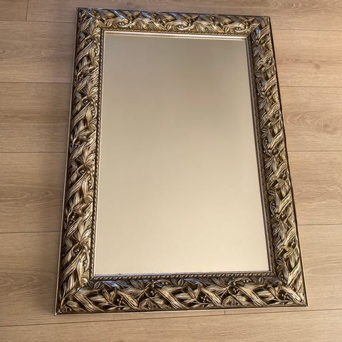Dekorativt spejl 70x70 med en sølvfarvet glasramme. Rammen er udsmykket med detaljerede mønstre og farvede indlæg. Velegnet til at tilføje et elegant touch til ethvert rum.