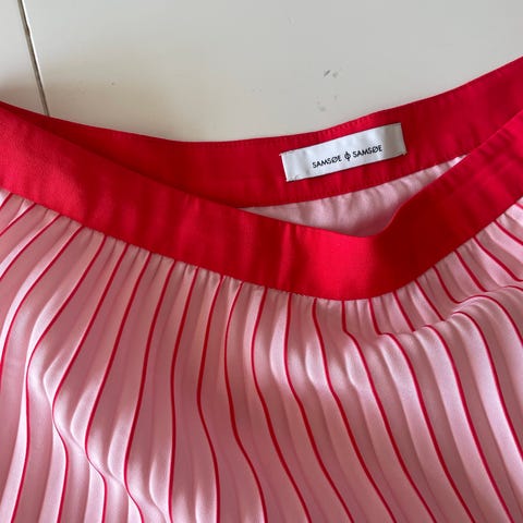 Finplisseret midinederdel i jersey med normal pasform. Elastisk linning. Hovedmaterialet er fremstillet i en blanding af genbrugt polyester. Dette produkt er GRS-certificeret. Hvert trin i forsyningskæden opfylder strenge sociale, miljømæssige og kemiske krav.