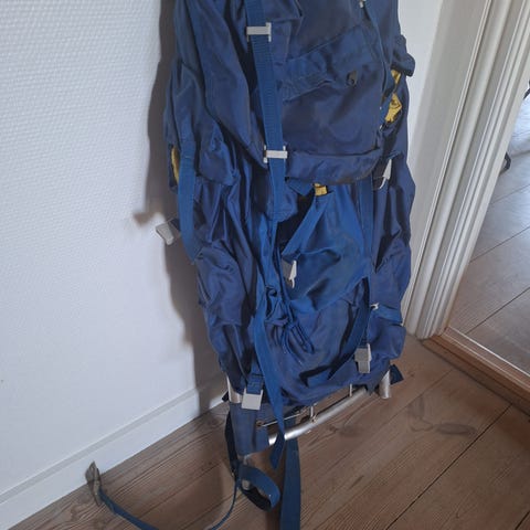 Stort vandtæt backpack fra FOX, ca 70-80 L. Brugt engang for ca 20 år siden på en backpacker rejse i Mexico :). Har mange siddelommer og lommer, der gør det nemt at organisere sig på turen.