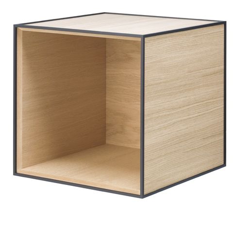 Frame 35 er en fleksibel opbevaringsløsning bestående af et kvadratisk modul i en kubistisk ramme. Det enkle opbevaringssystem er inspireret af Mogens Lassen’s Kubus lysestage fra 1962, som bygger på strenge matematiske formler og stor præcision. Hans mantra var ”at det hele skal hænge sammen”. På den måde skabes der ro og harmoni for øjet. Modulet kan hænges den direkte på væggen eller stå frit på gulvet. Kombiner Frame til en klassisk reol, et natbord, en rumdeler eller noget helt fjerde. Mulighederne for individuelle kombinationer er uendelige. Framemodulerne er tilgængelige med eller uden låger, hylder eller skuffer, så du kan finde den opbevaringsløsning, der matcher dit behov for organisering og opbevaring.