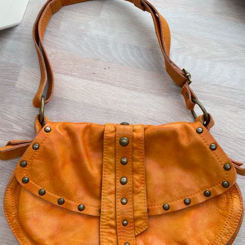 Meget fin skuldertaske, dog med brugsspor. Tasken er af læder. Hanken er 82 cm lang og kan tages af.