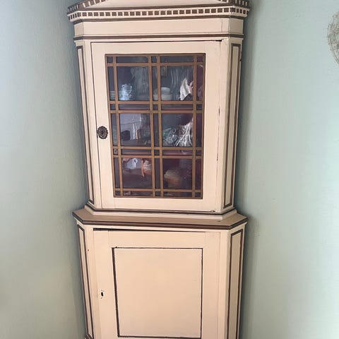 Virkelig flot og antikt hvid hjørneskab med flotte detaljer, som er i rigtig fin stand og meget dekorativ i en bolig!