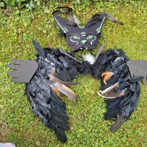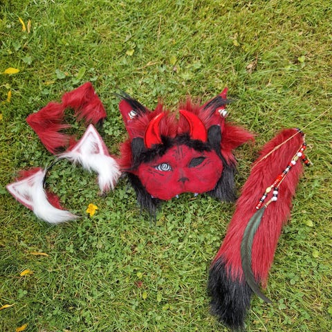 Masken er lavet med kvalitetsmaterialer af filt, pels og eye-mesh. Masken er 100% håndlavet og malet med akrylmaling. Sendes eller kan afhentes efter aftale.