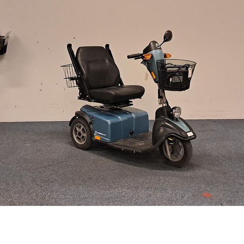Brugt 3-hjulet scooter med stor motor. Scooteren er manøvredygtig, så du nemt kan komme rundt omkring både udenfor og inde i supermarkedet. Det store sædet er monteret med justerbare armlæn og der er forkurv på styret.