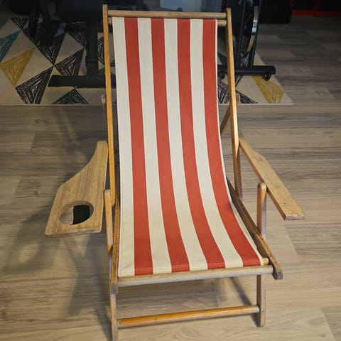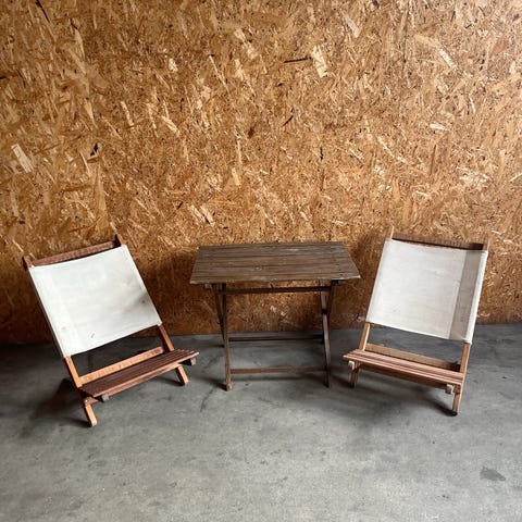 4 stk gamle sammenklappelige RETRO strandstole i træ med ensfarvet eller stribet lærred, som er et klassisk symbol på sommerens afslapning.