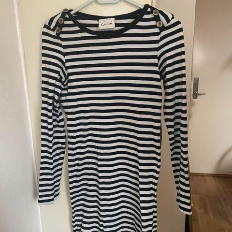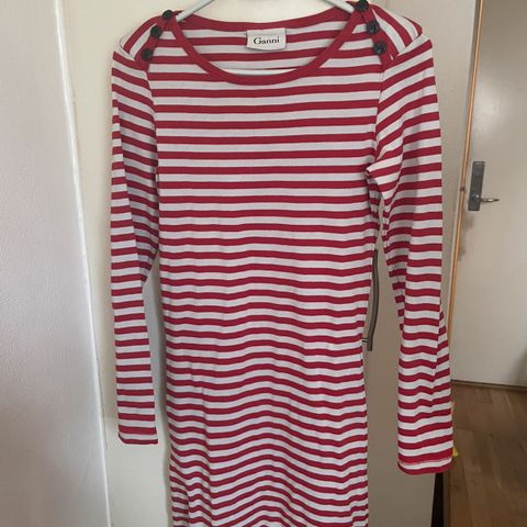OM VAREN: Ballon bluse med skørt og bindebånd i mælkedrengestriber fra Ganni