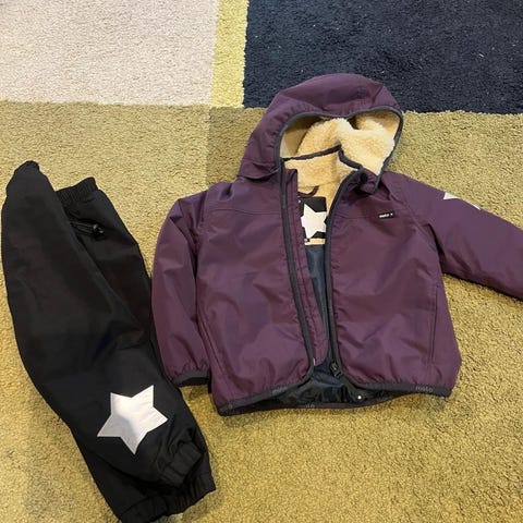 MMP fleece Termo sæt pæn gmb, jakke str 98, bukser 104 (bukser lidt små, så passer sammen i str.). Perfekt under regntøj el. Flyverdragt/skitøj , når det bliver koldere.
