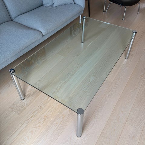 Erik Jørgensen. Sofabord model EJ-3010, Garfa. Glasplade monteret på aftagele ben af forkromet stål. H. 45,5 cm, L. 140 cm, B. 79 cm. Fremstår med brugsridser på glaspladen.