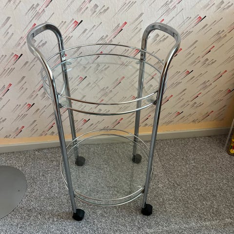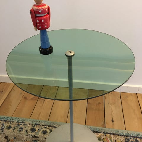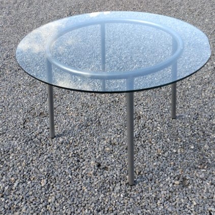 Rundt bord i glas og stål som kan bruges til mange forskellige formål.