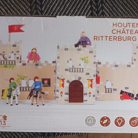 Fin legetøjsborg, 4 etager, med trappe, reb-trappe, kran, seng og fængsel.