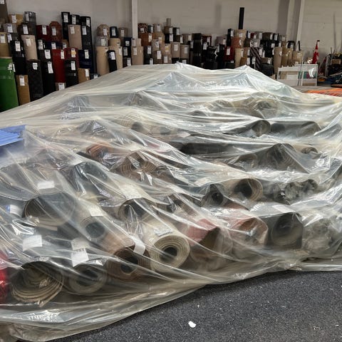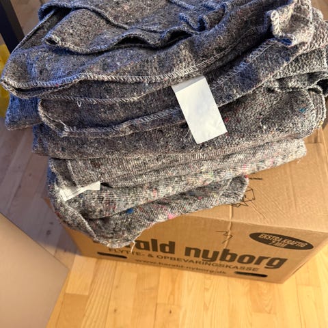 En kasse med flyttetæpper, både store og små. Sælges samlet.