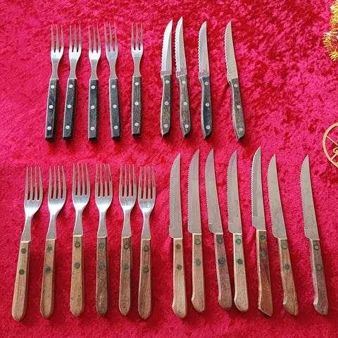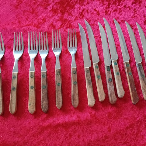 4 grill knive, 4 middagsgafler og 1 alm. middagskniv.