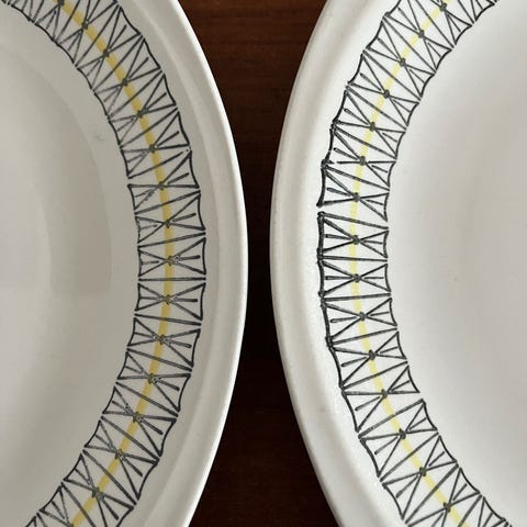 6 tallerkener (2 med skår på undersiden) fra serien "Ruter" fra Upsala Ekeby Gefle. Tallerkenerne er designet af Helmer Ringström. De blev produceret mellem 1957 og 1970. 23 x 23 cm. De har et karakteristisk mønster med røde og sorte ruder langs kanten. Prisen er samlet. De to med skår er gratis.