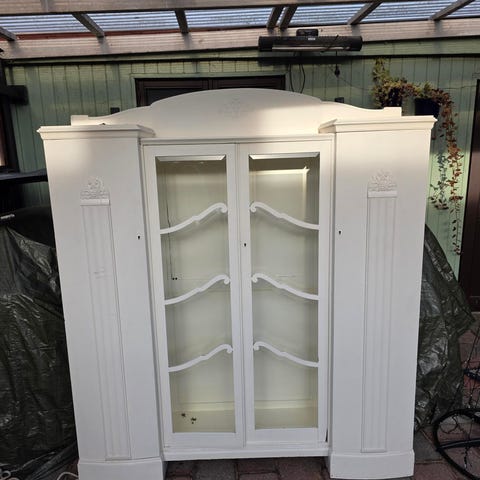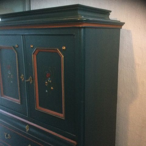 Super fint, gammelt almueskab håndmalet i brun, lyserød og grøn med fine detaljer. Ingen fejl og mangler. Med hylder og glasruder.